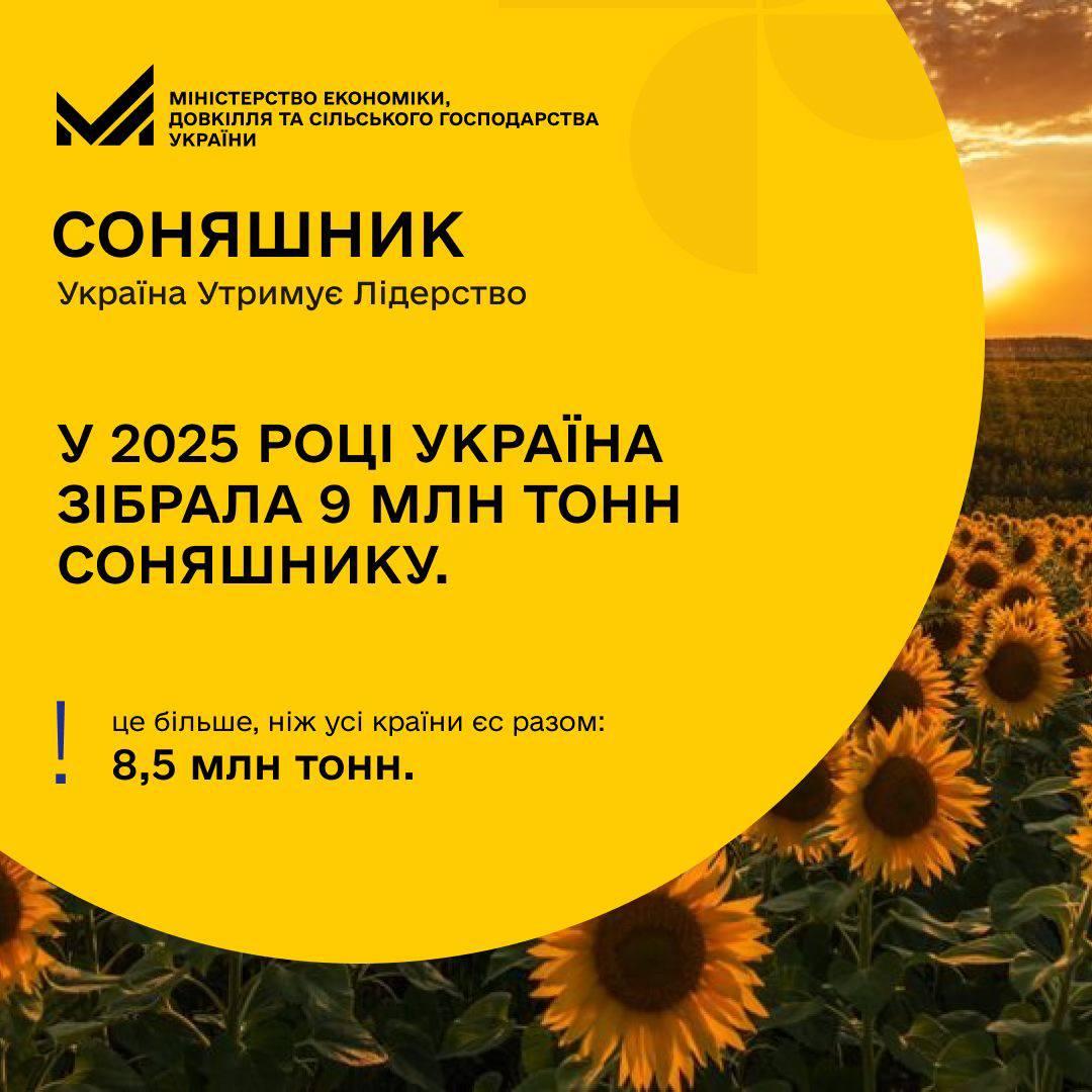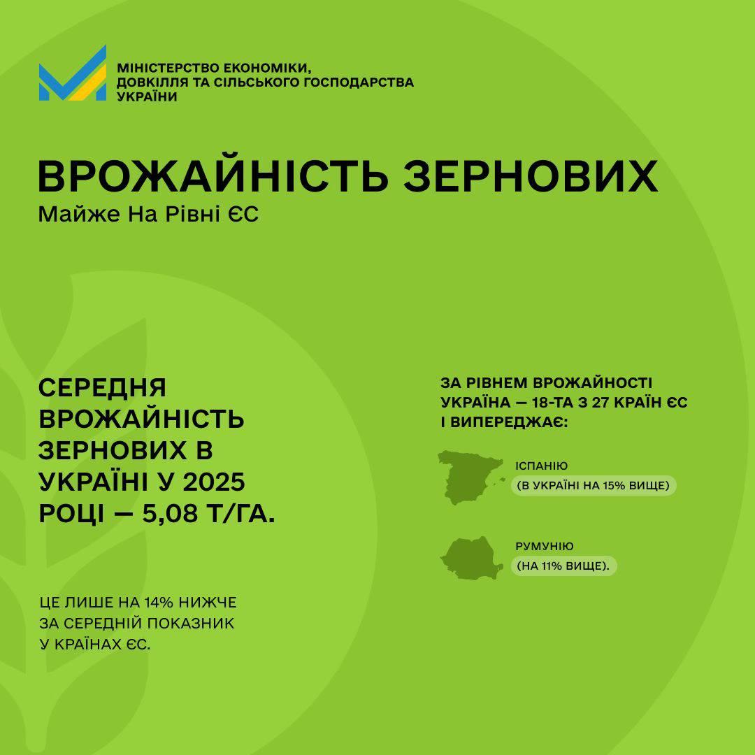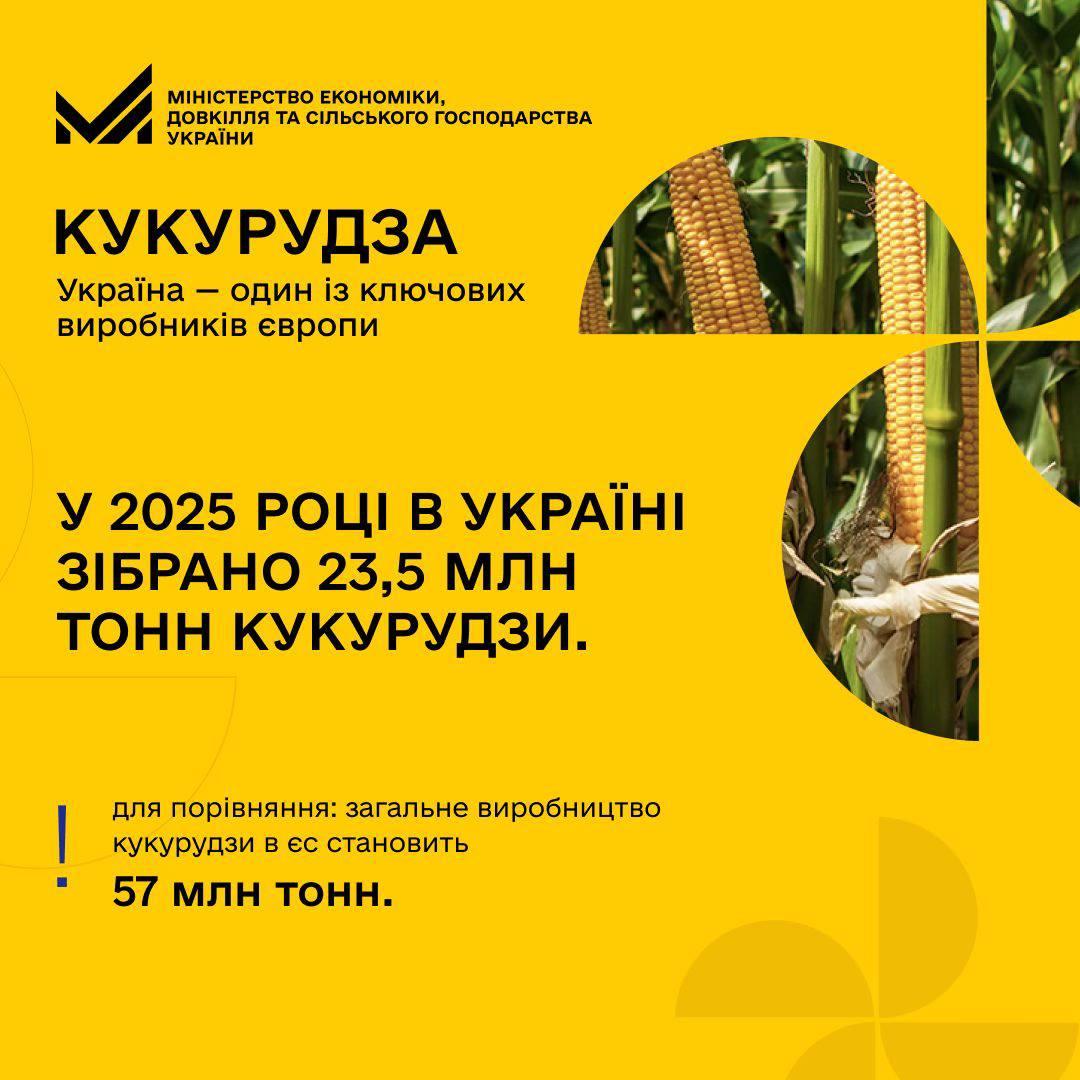 Після завершення збирання кукурудзи загальний обсяг виробництва зернових очікується на рівні близько 60 млн тонн. У виробництві кукурудзи Україна є безумовним лідером: у 2025 році зібрано 23,5 млн тонн, тоді як загальний обсяг виробництва цієї культури в ЄС становить 57 млн тонн. За соняшником Україна також утримує лідерство – 9 млн тонн проти 8,5 млн тонн у всіх країнах ЄС разом», — сказано у повідомленні прес-служби Мінекономрозвитку.