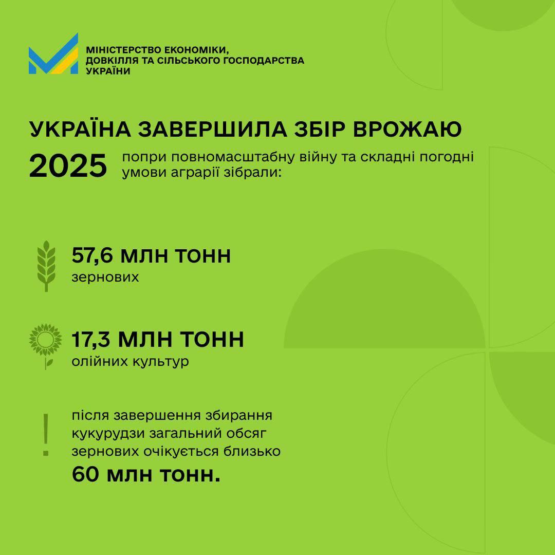 Україна завершила збір врожаю у 2025 році, зібравши 57,6 млн т зернових та 17,3 млн т олійних культур. Такі дані озвучив заступник міністра економіки, довкілля та сільського господарства України Тарас Висоцький.