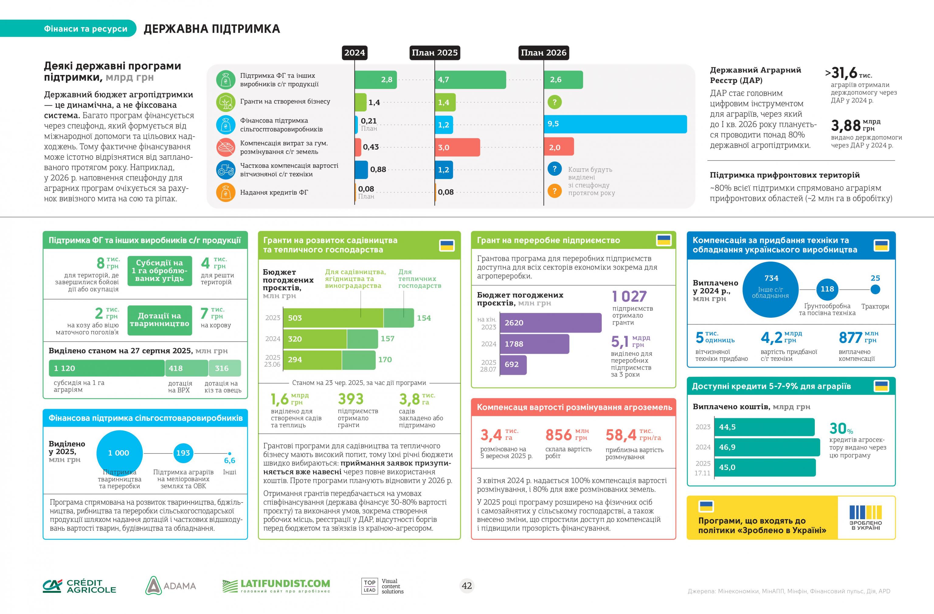 Понад 10 років ми разом із партнерами створюємо інфографічний довідник для агробізнесу, який став важливим джерелом аналітики та експертизи від Креді Агріколь. За цей час галузь проходила через різні виклики – від кліматичних змін до реалій повномасштабної війни – і щороку доводила свою стійкість. Цьогоріч ми знову бачимо, як українські аграрії, попри всі ризики, продовжують працювати, інвестувати та відновлювати виробництво, і це мотивує нас робити аналітику ще глибшою та кориснішою для ринку. Для Креді Агріколь підтримка агробізнесу – це не лише про фінансування, а й про можливість поділитися експертизою що допомагає ринку рухатися вперед. Ми й надалі будемо поруч із клієнтами та партнерами, підтримуючи галузь у її зростанні та відновленні», – коментує запуск довідника директорка департаменту підтримки агробізнесу та ESG-напряму Креді Агріколь Банку Наталія Порвіна.