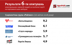 Результати 6-ти опитувань електоральних симпатій людей за політичні партії на парламентських виборах...